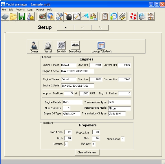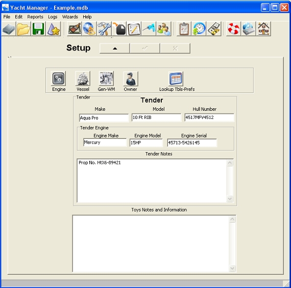 There are four (4) Setup Sceens. Use these to enter basic information about your vessel that Yacht Manager will then use to automatically calculate main engine fuel usage on trips, generator fuel usage, water maker product production calculations and much more.